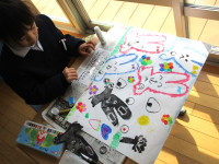 3校時、1、2年生の図工の授業を訪問しました。型紙で作った生き物の形を写して、楽しい作品ができました。